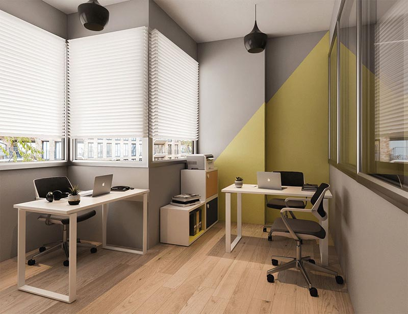 - Tạo không gian mở và thoáng đãng: Chọn các gam màu trắng, be, xanh nhạt,… để decor văn phòng diện tích nhỏ, giúp tạo cảm giác không gian rộng rãi hơn. Hạn chế sử dụng các gam màu tối, đậm vì chúng có thể khiến không gian trở nên chật chội. Bố trí bàn làm việc gần cửa sổ để tận dụng tối đa ánh sáng tự nhiên.